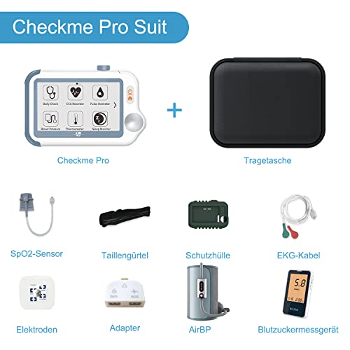 Riceverai: Checkme Pro Suit Monitor, cavo ed elettrodi ECG, sensore SpO2, fascia da polso, cavo di ricarica, copertura protettiva in silicone, cordino, accessorio per la pressione sanguigna, kit per la misurazione della glicemia (strisce reattive, pungidito, lancetta sterile inclusi), manuale utente, una custodia da trasporto. 12 mesi di garanzia e