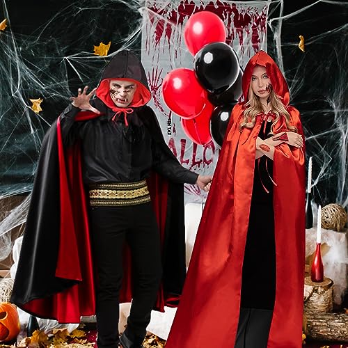 WELLXUNK Mantello Vampiro di Halloween, 140cm Mantello Cappuccio Nero Rosso con Tatuaggio Cicatrice e Denti da Vampiro, Reversibile Nero Rosso Mantello per Festa di Halloween