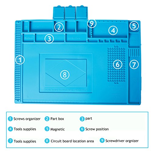 【Più scomparti e multifunzione】: secondo il modello dei pezzi, ci sono diverse zone di posizionamento: per le viti, i circuiti stampati e gli strumenti. Il fondo del tappeto è magnetico e può aiutarvi a posizionare e riporre i pezzi per evitare la loro perdita.