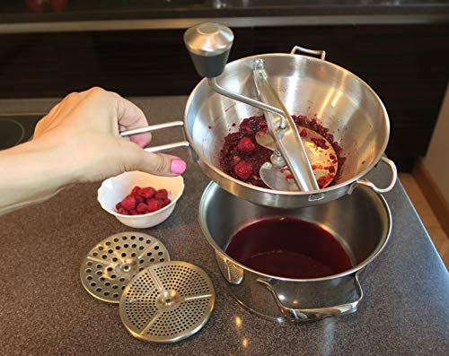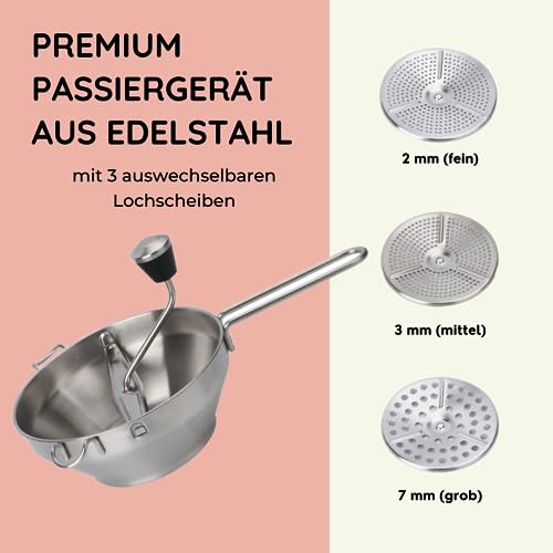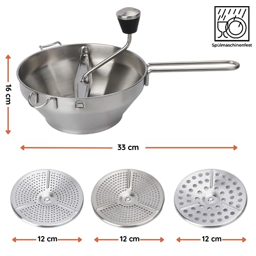 Wenburg Facile da usare Passaverdure Manuale Acciaio Inox - Versatile Passatutto Acciaio Inox con 3 Setaccio - Lavabile in Lavastoviglie - Passaverdura per Filtrare Frutta e Verdura (19,5 cm)