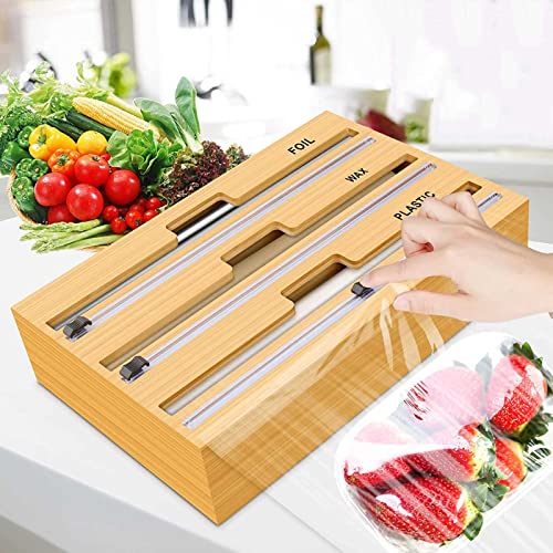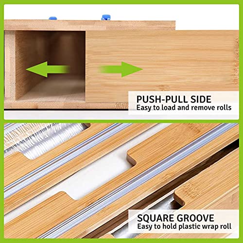 WENCY 3 in 1 Dispenser di Fogli di Alluminio,Dispenser per Imballaggi in Legno di bambù con taglierino,Organizzazione e stoccaggio di Fogli di Alluminio per Cassetto della Cucina