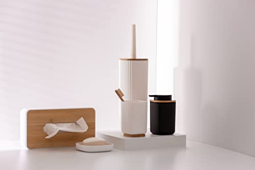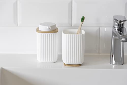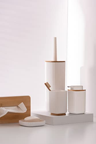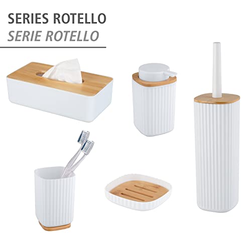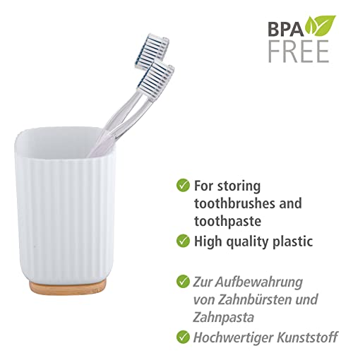 Wenko Bicchiere Porta Spazzolini Rotello, Bicchiere per Spazzolini in Plastica e Fondo di Bambù, per Riporre Accessori Dell'Igiene Orale con Pratico Design Rigato, Ø 8,6 X 11,1 Cm, Bianco/Naturale