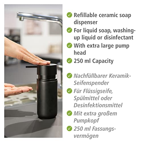 WENKO Dosatore di sapone Silo nero, dispenser in ceramica ricaricabile max. 250 ml di sapone liquido, detersivo per piatti o disinfettante, erogatore a pompa in plastica ABS extra grande, ∅ 6,2x16,5cm