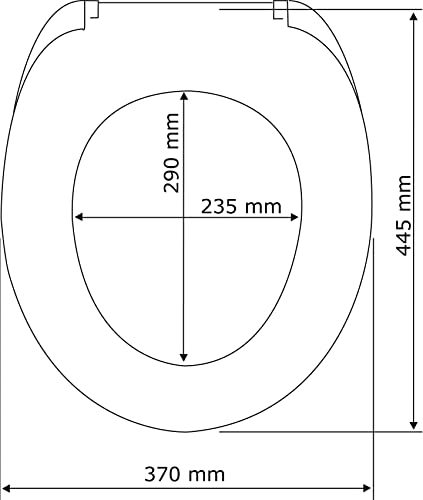 Dimensioni (L x P): Copriwater - 35 x 43,5 cm / Anello esterno - 37 x 44,5 cm / Anello interno - 23,5 x 29 cm / Distanza fissaggio - 12-16,5 cm / Peso: 2 kg