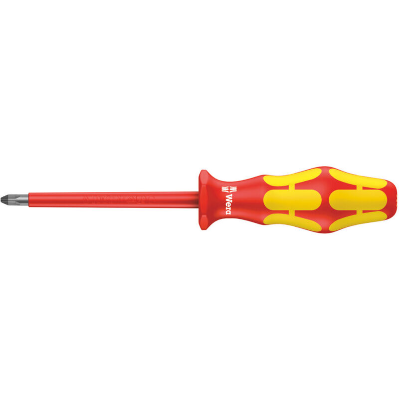 Impugnatura e lama completamente isolate fino a 1000 V secondo DIN EN 60900 / VDE 0682-201. Ogni giraviti viene testato singolarmente in acqua contro la scossa elettrica. L'impugnatura Kraftform in plastica resistente agli urti, con zone morbide integrate facilita la trasmissione del momento torcente e pertanto non stanca né mano né braccio. Lama in acciaio speciale altamente legato. Superficie cromata nicromatt, punte brunite o Lasertip rivestite chimicamente con nichel. Uso: Per lavori su impianti elettrici in tensione fino a 1000 V. Dati tecnici Norma DIN EN IEC 60900 / VDE 0682-201 Tipo di prodotto Giravite Lunghezza complessiva, mm 205 Lunghezza lama, mm 100 Punta della lama Lasertip Dimensione dell'impronta a croce 2 Per ⌀ viti, mm 3,1 − 5,2 Denominazione originale prodotto 162 i PH VDE