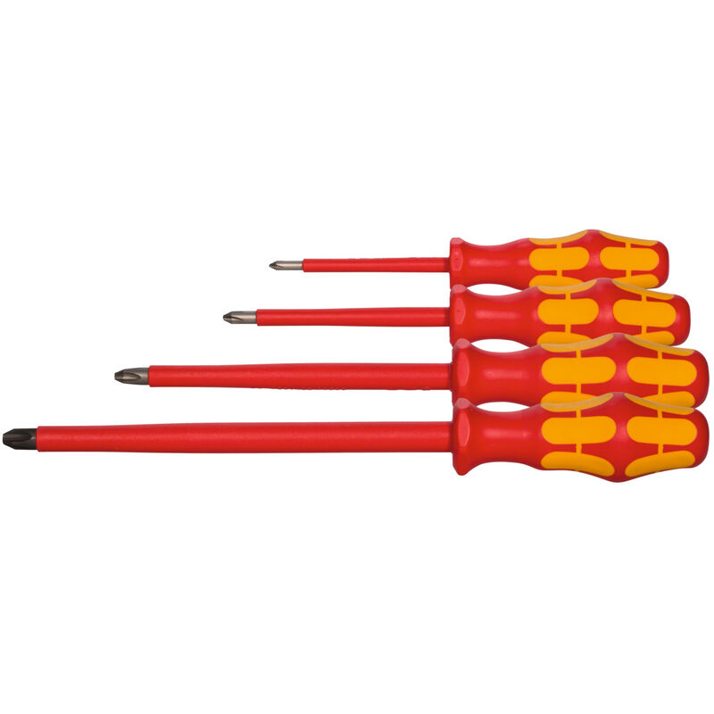 Impugnatura e lama completamente isolate fino a 1000 V secondo DIN EN 60900 / VDE 0682-201. Ogni giraviti viene testato singolarmente in acqua contro la scossa elettrica. L'impugnatura Kraftform in plastica resistente agli urti, con zone morbide integrate facilita la trasmissione del momento torcente e pertanto non stanca né mano né braccio. Lama in acciaio speciale altamente legato. Superficie cromata nicromatt, punte brunite o Lasertip rivestite chimicamente con nichel. Uso: Per lavori su impianti elettrici in tensione fino a 1000 V. Fornitura: cad. 1 chiave n. art. 668600: Dim. 1;