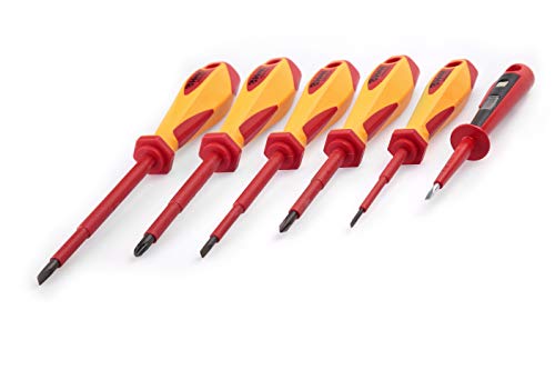 Contenuto della confezione: 5 cacciaviti VDE fino a 1.000 V, 1 tester di tensione VDE fino a 250 V