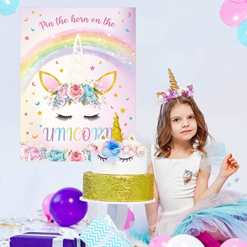 WERNNSAI Pin the Horn on the Unicorn Game - 51 × 73 cm Unicorn Party Game per bambini ragazze con 24 pezzi corna unicorno, accessori per feste di compleanno per la parete casa decorazione della stanza