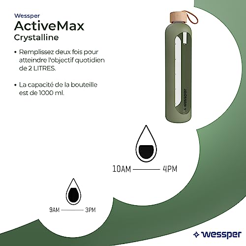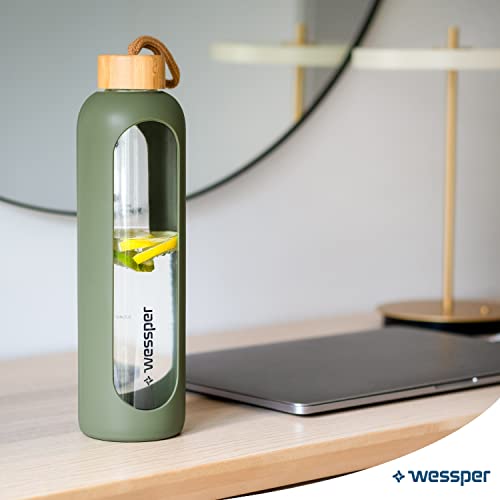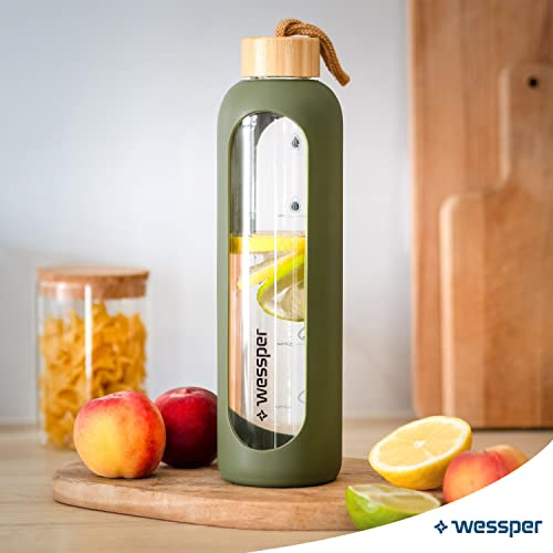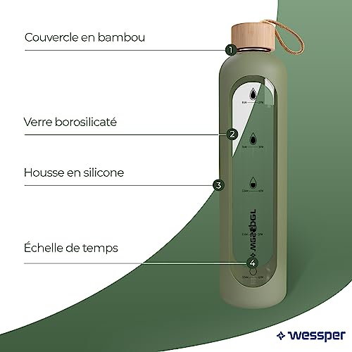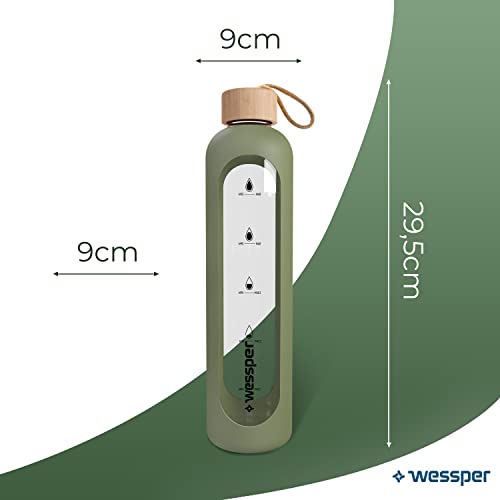 Wessper Drinkmotivation (WES260) - Bottiglia in vetro borosilicato con indicazione del tempo, 1 litro, ermetica, con coperchio in bambù, riutilizzabile, con coperchio in silicone, colore: oliva