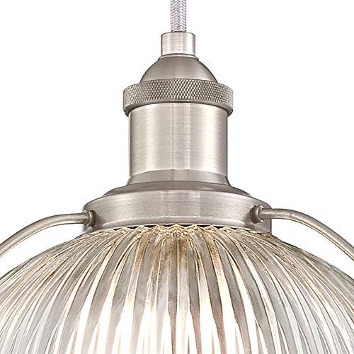 La lampada a sospensione monoluce con paralume in vetro a costine chiaro e finitura in nichel spazzolato dona un fascino retro a qualsiasi ambiente