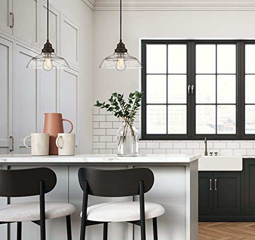 La lampada a sospensione in stile vintage-industriale dotata di una finitura in bronzo lucidato a olio con punti brillanti e di un paralume in vetro a bolle trasparente soffiato a mano è ottima per il lavoro e l'atmosfera