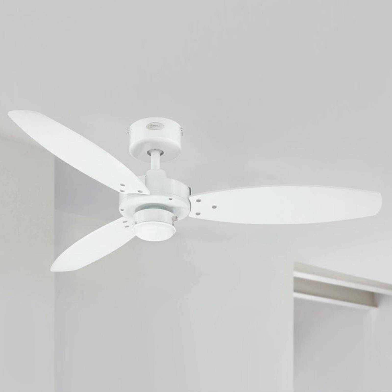 Ventilatore da soffitto Jet II dal look giovane e moderno Jet II sfoggia un look completamente bianco o bicolore con pale in acero chiaro, così da essere adattato in qualsiasi momento ai colori dell'arredamento. Questo ventilatore dà il meglio di sé in ambienti fino a 15 m² di grandezza: nella stagione calda viene impostato con rotazione verso sinistra per creare una piacevole aria rinfrescante. In inverno la rotazione verso destra consente di distribuire l'aria calda in modo ottimale nell'ambiente favorendo un vantaggioso risparmio in termini di costi di riscaldamento. È possibile impostare fino a 3 velocità e 3 livelli di potenza: 49 W - 220 giri/min., 35 W - 169 giri/min., 32 W - 123 giri/min. Jet II è in grado di mantenere una piacevole brezza fresca in ogni stanza per godersi appieno l'estate. - Il telecomando e l'interruttore da parete sono ordinabili nella sezione accessori