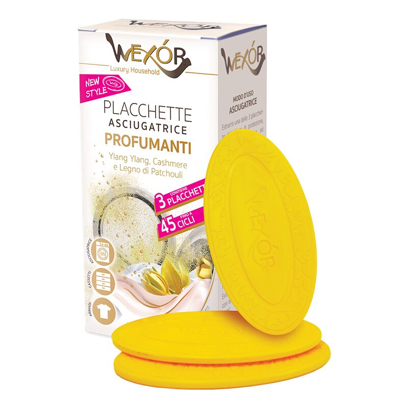 Placchette Asciugatrice Profumanti Ylang Ylang, Cashmere e Legno di Patchouli Placchette profumanti per l'asciugatrice con fragranza resistente alle alte temperature . Ogni placchetta è utilizzabile per ben 15 cicli di asciugatura . L'innovativa forma piatta consente loro di scivolare agilmente tra i tessuti durante il ciclo di asciugatura, garantendo meno rumore nel cestello e un profumo uniforme su tutti i capi. Può essere utilizzata anche come profumatore per armadi e cassetti, se riposta in questi piccoli spazi tra un'asciugatura e l'altra o al termine dei 15 cicli. La placchetta continuerà a profumare per mesi. Un sistema innovativo, pratico ed economico per profumare i capi anche dopo il lavaggio, sia in asciugatrice che dopo averli riposti. PROFUMO RESISTENTE ALLE ALTE TEMPERATURE!