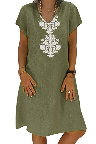 Wexuua Abito da Donna Estate Manica Corta Scollo a V Casual Midi Chic Vintage Abito Estivo Etnico Lino Tinta Unita Abiti di Lino, Blu