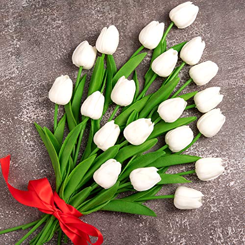 Whaline - Bouquet di 20 tulipani finti, realistici al tatto, in lattice, decorazione floreale per casa, giardino, matrimoni, feste (bianco)
