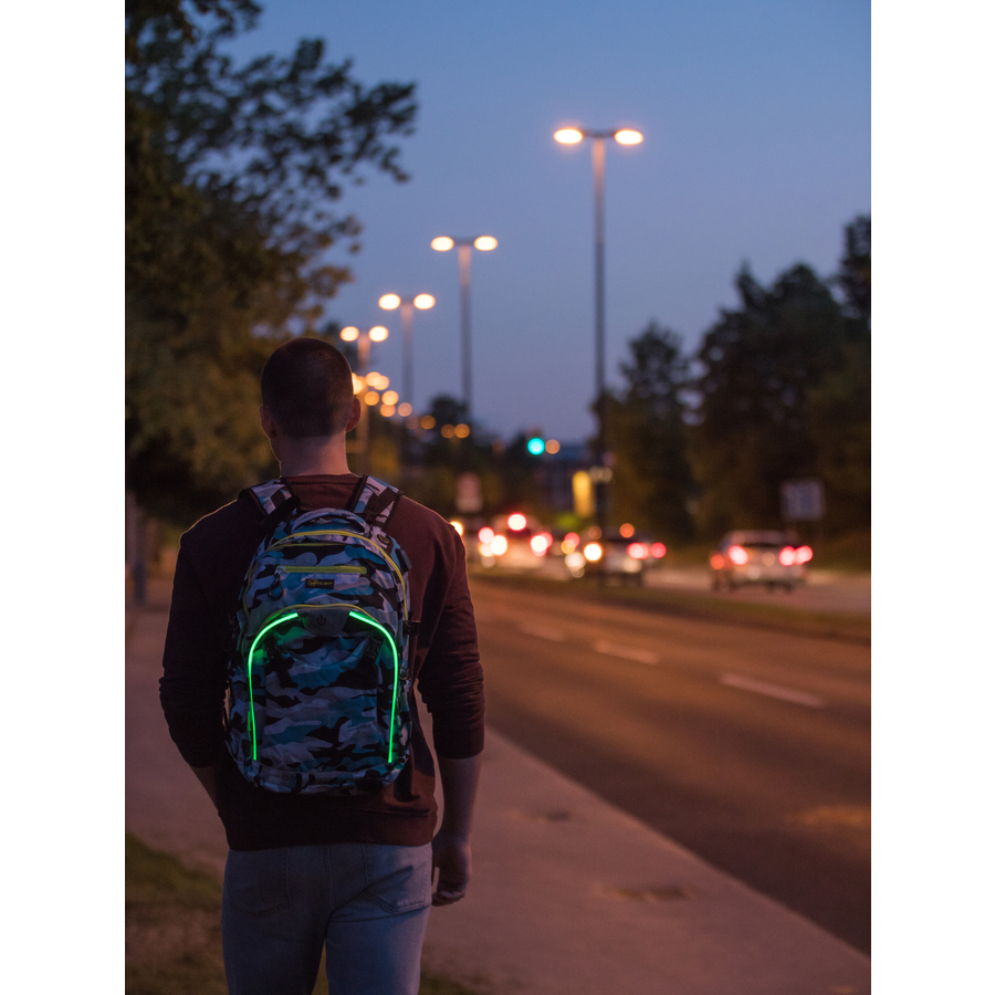 Dettagli del prodotto: Peso massimo del carico: 15 kg Con schienale fisso e imbottito, cinghie regolabili imbottite e base rinforzata Dotato della nota luce a LED (di colore verde - la luce verde è visibile soprattutto da lontano) e di strisce riflettenti aggiuntive, offre la massima visibilità e sicurezza al crepuscolo e al buio Interruttore di accensione/spegnimento della luce LED con 3 impostazioni (acceso continuo, lampeggiante lentamente, lampeggiante velocemente) Robusto materiale in poliestere 600D, doppiamente gommato per garantire durata e protezione dall'umidità Sistema di circolazione dell'aria sul retro Con porta USB per la ricarica del telefono cellulare (cavo di collegamento incluso) aden Con uscita per le cuffie 3 scomparti principali 1 scomparto più piccolo 3 scomparti antifurto nascosti Con scomparto per laptop 2 scomparti per banche Power Incluso organizzatore di piccole parti Con maniglia per il trasporto Ha una fascia toracica regolabile in altezza con fischietto d'emergenza e una cintura per i fianchi Tasche esterne laterali in rete e cinghie laterali per il fissaggio di maglioni e simili, pattini board - o per il fissaggio della giacca sul retro dello zaino Richiede 2 batterie CR032 Illumina per 100 ore Dimensioni e peso: Dimensioni da assemblato (lunghezza x larghezza x altezza): 46 x 32 x 20 cm Dimensioni dello scomparto per laptop (lunghezza x larghezza x altezza): 40 x 28 x 3,5 cm Volume: 30 litri Materiale e cura: Materiale: Poliestere 600D Incluso nella consegna: Wheel Bee ® Zaino Generation Z, camouflage blu 2 batterie CR032
