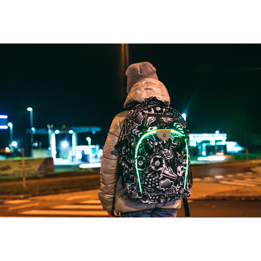 Dettagli del prodotto: Peso massimo del carico: 15 kg Con schienale fisso e imbottito, cinghie regolabili imbottite e base rinforzata Dotato della nota luce a LED (di colore verde - la luce verde è visibile soprattutto da lontano) e di strisce riflettenti aggiuntive, offre la massima visibilità e sicurezza al crepuscolo e al buio Interruttore di accensione/spegnimento della luce LED con 3 impostazioni (acceso continuo, lampeggiante lentamente, lampeggiante velocemente) Robusto materiale in poliestere 600D, doppiamente gommato per garantire durata e protezione dall'umidità Sistema di circolazione dell'aria sul retro Con porta USB per la ricarica del cellulare (cavo di collegamento incluso) aden Con uscita per le cuffie 3 scomparti principali 1 scomparto più piccolo 3 scomparti antifurto nascosti Con scomparto per laptop 2 scomparti per banche Power Incluso organizzatore di piccole parti Con maniglia per il trasporto Ha una fascia toracica regolabile in altezza con fischietto d'emergenza e una cintura per i fianchi Tasche esterne laterali in rete e cinghie laterali per il fissaggio di maglioni e simili, pattini board - o per il fissaggio della giacca sul retro dello zaino Richiede 2 batterie CR032 Illumina per 100 ore Dimensioni e peso: Dimensioni da assemblato (lunghezza x larghezza x altezza): 46 x 32 x 20 cm Dimensioni dello scomparto per laptop (lunghezza x larghezza x altezza): 40 x 28 x 3,5 cm Volume: 30 litri Materiale e cura: Materiale: Poliestere 600D Incluso nella consegna: Wheel Bee ® Zaino Generation Z, Cool 2 batterie CR032