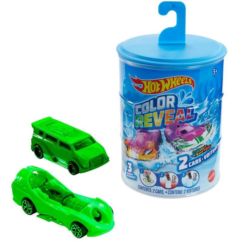 La confezione da 2 veicoli Hot Wheels Colour Reveal contiene sorprese incredibili! Il piccolo barile contiene all'interno due macchinine Hot Wheels Colour Reveal in scala 1:64, ricoperte da uno speciale rivestimento Color Reveal. Per scoprire il colore per la prima volta, riempi il barile con dell'acqua e crea un mulinello per ciascuna macchinina finché non vedrai l'acqua cambiare colore. Estrai la macchinina ed ecco che appariranno le splendide decorazioni che erano nascoste sotto il rivestimento! Vuoi cambiarne di nuovo il colore? Riempi il barile con dell'acqua fredda e immergi ogni macchinina per un'altra fantastica trasformazione! Falle tornare al colore originario immergendole nell'acqua calda! Ripeti questa operazione più e più volte, alternando acqua calda e acqua fredda. Sarà come avere due macchine in una! Il piccolo barile funge da vasca per l'immersione delle Hot Wheels, ma è anche perfetto per riporle! Ogni confezione da due veicoli è in vendita separatamente, secondo