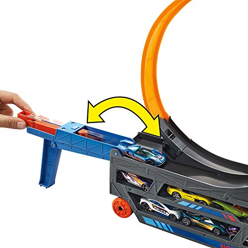 Questo leggendario trasportatore può portare fino a 18 macchinine, include un veicolo hot wheels, offre un loop autentico ed è anche un playset