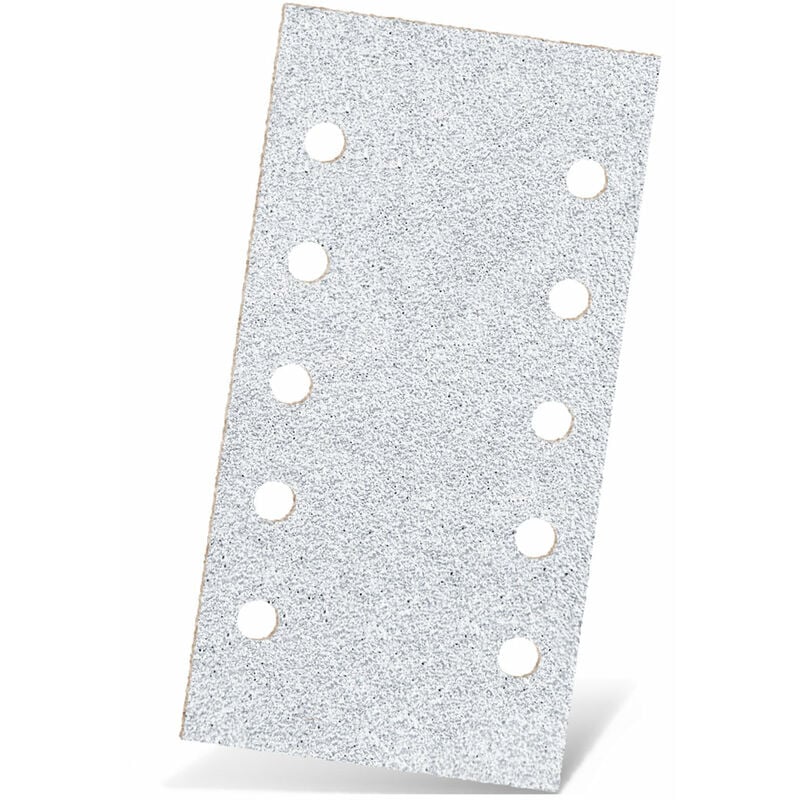 Carte abrasive velcrate MENZER, G120 Informazioni sul Prodotto Elevate prestazioni di asportazione Elevata qualità della superficie Riduzione dell'intasamento del disco abrasivo Dati tecnici Supporto: Carta UltraFlex Dimensioni: 230 x 115 mm Tipo di abrasivo: Fogli abrasivi Attacco: Sistema a strappo Grana classificazione: Media Foratura: 10 fori Tipo di grana: Corindone normale Applicazione Legno: 7/10 Gesso, stucco: 8/10 Colore, vernice: 8/10 Legenda: 10 - molto adatto, 0 - non adatto Descrizione del Prodotto MENZER White - Il prodotto classico per le finiture interne. Eccezionale su colori, vernici e stucchi MENZER White è lo specialista comprovato per le finiture interne ed è perfetto per la lavorazione di gesso e stucchi ma anche di colori e vernici. Lo speciale rivestimento CoolTec di MENZER impedisce in modo efficace che l'abrasivo possa intasarsi prematuramente. Pertanto, White MENZER ha una lunga durata su superfici termoplastiche come materiali plastici e vernici. White