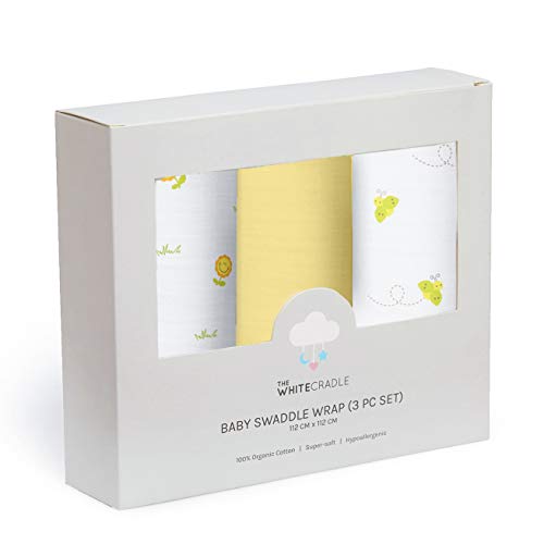 The White Cradle Copertina Swaddle - 100% cotone organico - Grande 112x112 cm, avvolgente per bebè in mussole super morbida. pacco da 3 pezzi per neonato - Girasole 3 Design