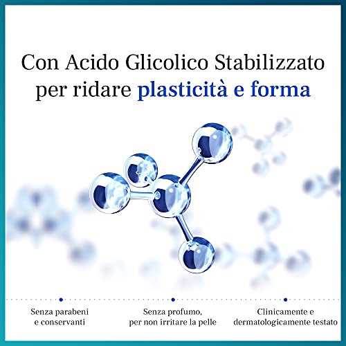 L'acido glicolico stabilizzato aiuta a ridare plasticità e forma alla pelle. Il prodotto è clinicamente e dermatologicamente testato, senza parabeni e conservanti e senza profumo, per non irritare la pelle.