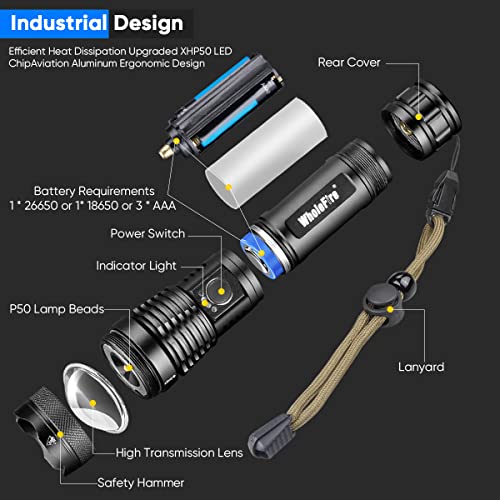 WholeFire Torcia led Ricaricabile USB da 10000 Lumen, Potente Torcia Luminosa Alimentata A Batteria, Impermeabile, Zoomabile Per Campeggio, Militari, Emergenza (Batteria da 3000 mAh Inclusa)