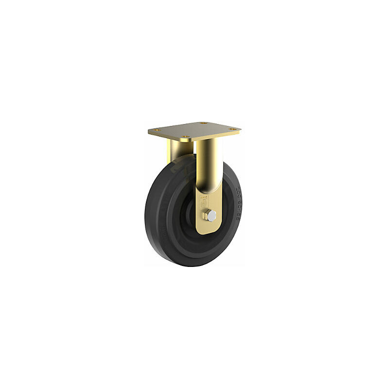 Ruota elastica in gomma piena, corpo in acciaio, saldato, Ø x larghezza ruote 160 x 50 mm, rotella a supporto fisso. Fornitura = montato. Diametro ruote = 160 mm. Forma = rotella a supporto fisso. Materiale ruote = gomma - gomma piena - elastico. Materiale cerchioni = lamiera d'acciaio. Materiale corpo = acciaio. Portata a 4 km/h = 400 kg. Tipo di fissaggio = con piastra di fissaggio. Larghezza ruote = 50 mm. Altezza d'ingombro = 205 mm. Cuscinetti ruota = cuscinetto a sfera. Resistenza alle temperature = da -20 °C fino a +80 °C. Diametro fori filettati = 11 mm. Dimensioni piastra rotella a supporto fisso mm = 135x110 mm. Interasse fori filettati = 105x75/80 mm. Superficie del corpo = cromato in giallo. Su pesante cerchione in lamiera d'acciaio. Portata elevata. Con nipplo di lubrificazione. Durezza 63 Shore A. Resistenti a temperature da -20 °C a +80 °C. Cuscinetti di sterzo con corona a sfere doppia, completi di protezione. Superficie di scorrimento vulcanizzata. La gomma nera può