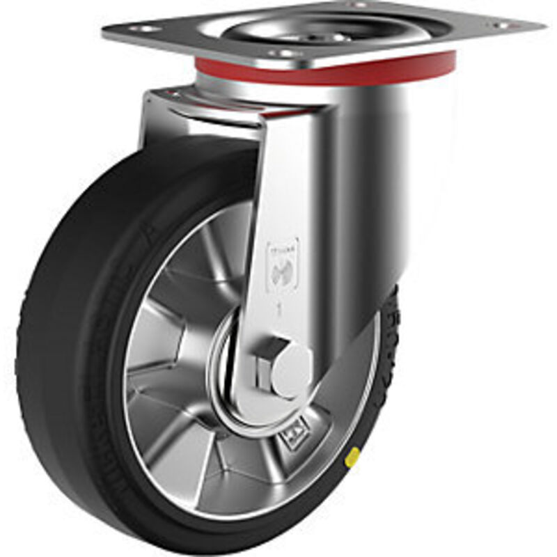 Ruota in gomma elastica ESD, Ø x larghezza ruota 160 x 50 mm, portata 400 kg, rotella pivottante. Fornitura = montato. Diametro ruote = 160 mm. Forma = rotella pivottante. Materiale ruote = gomma - gomma piena - elastico. Materiale cerchioni = alluminio. Materiale corpo = acciaio. Portata a 4 km/h = 400 kg. Tipo di fissaggio = con piastra di fissaggio. Larghezza ruote = 50 mm. Altezza d'ingombro = 190 mm. Cuscinetti ruota = cuscinetto a sfera. Sporgenza rotelle pivottanti = 60 mm. Diametro fori filettati = 11 mm. Dimensioni piastra rotella a supporto fisso mm = 135x114 mm. Dimensioni piastra rotella pivottante = 135x110 mm. Interasse fori filettati = 105x75/80 mm. Superficie del corpo = zincatura. Su cerchione in alluminio. Conduttività elettrica fino a R < 10^4 Ω. Comfort di guida molto elevato. Cuscinetti girevoli con corona a sfere doppia.