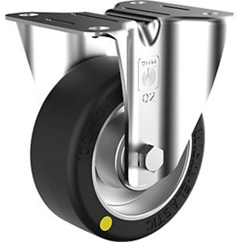 Ruota in gomma elastica ESD, Ø x larghezza ruota 125 x 40 mm, portata 250 kg, rotella a supporto fisso. Fornitura = montato. Diametro ruote = 125 mm. Forma = rotella a supporto fisso. Materiale ruote = gomma - gomma piena - elastico. Materiale cerchioni = alluminio. Materiale corpo = acciaio. Portata a 4 km/h = 250 kg. Tipo di fissaggio = con piastra di fissaggio. Larghezza ruote = 40 mm. Altezza d'ingombro = 155 mm. Cuscinetti ruota = cuscinetto a sfera. Diametro fori filettati = 11 mm. Dimensioni piastra rotella a supporto fisso mm = 135x114 mm. Interasse fori filettati = 105x75/80 mm. Superficie del corpo = zincatura. Su cerchione in alluminio. Conduttività elettrica fino a R < 10^4 Ω. Comfort di guida molto elevato. Cuscinetti girevoli con corona a sfere doppia.