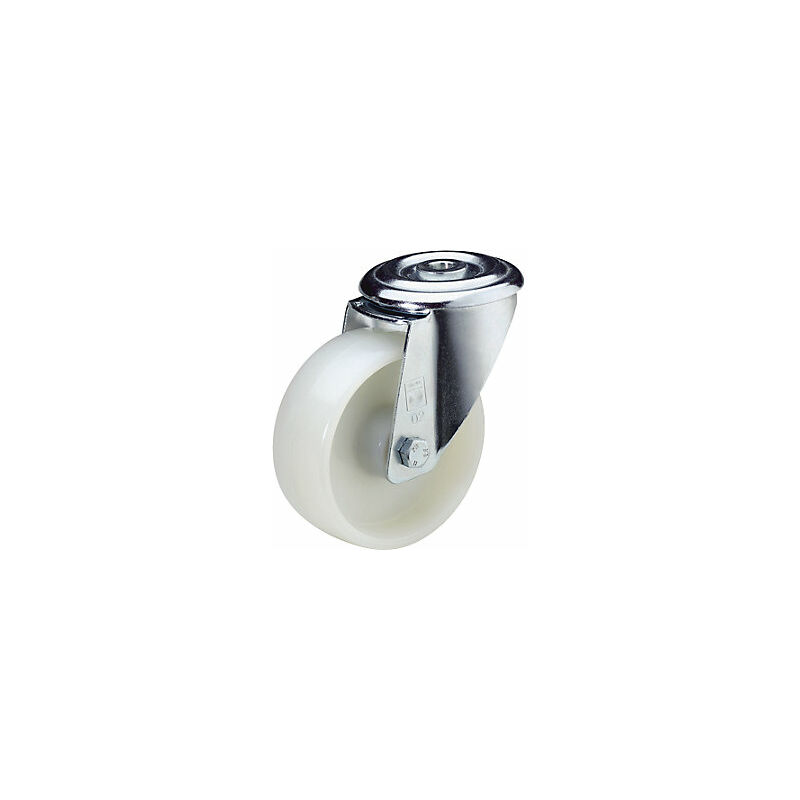 Ruota in poliammide con foro complementare, Ø x larghezza ruota 100 x 38 mm, rotella pivottante. Fornitura = montato. Diametro ruote = 100 mm. Forma = rotella pivottante. Materiale ruote = plastica - poliammide. Materiale cerchioni = poliammide. Materiale corpo = acciaio. Portata a 4 km/h = 180 kg. Tipo di fissaggio = con foro complementare. Larghezza ruote = 38 mm. Altezza d'ingombro = 125 mm. Cuscinetti ruota = cuscinetto a rulli. Resistenza alle temperature = da -20 °C fino a +80 °C. Sporgenza rotelle pivottanti = 38 mm. Lunghezza mozzo = 40 mm. Foro mozzo = 12 mm. Diametro foro complementare = 12 mm. Diametro piastra = 70 mm. Superficie del corpo = zinco-cromata. Scorrimento agevole, non richiedono manutenzione. Non temono la maggior parte di acidi e basi diluiti. Resistenti all'attrito. Resistenti a temperature da -20 °C a +80 °C. Cuscinetti di pivottaggio con corona a sfere doppia.