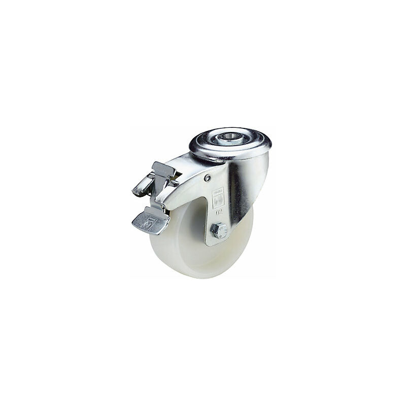 Ruota in poliammide con foro complementare, Ø x larghezza ruota 125 x 38 mm, rotella pivottante con fermo doppio. Fornitura = montato. Diametro ruote = 125 mm. Forma = rotella pivottante con fermo doppio. Materiale ruote = plastica - poliammide. Materiale cerchioni = poliammide. Materiale corpo = acciaio. Portata a 4 km/h = 200 kg. Tipo di fissaggio = con foro complementare. Larghezza ruote = 38 mm. Altezza d'ingombro = 155 mm. Cuscinetti ruota = cuscinetto a rulli. Resistenza alle temperature = da -20 °C fino a +80 °C. Sporgenza rotelle pivottanti = 38 mm. Lunghezza mozzo = 50 mm. Foro mozzo = 15 mm. Diametro foro complementare = 12 mm. Diametro piastra = 70 mm. Superficie del corpo = zinco-cromata. Scorrimento agevole, non richiedono manutenzione. Non temono la maggior parte di acidi e basi diluiti. Resistenti all'attrito. Resistenti a temperature da -20 °C a +80 °C. Cuscinetti di pivottaggio con corona a sfere doppia.