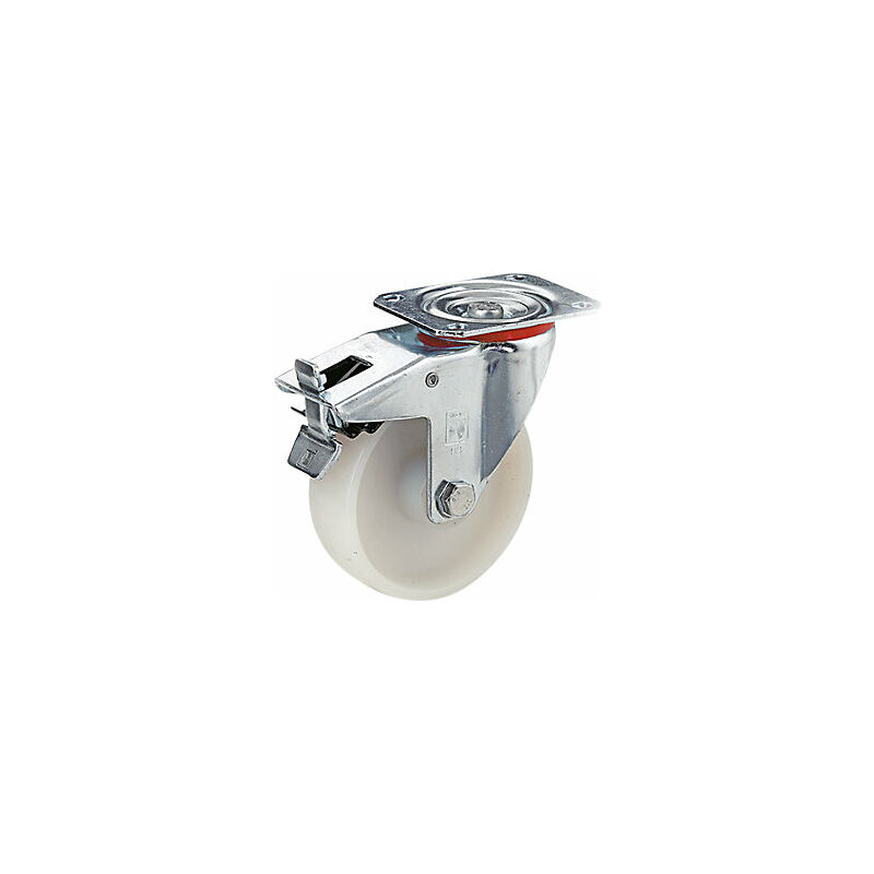 Ruota in poliammide, supporto in lamiera di acciaio, Ø x larghezza ruota 80 x 35 mm, rotella pivottante con fermo doppio, cuscinetti a rulli. Fornitura = montato. Diametro ruote = 80 mm. Forma = rotella pivottante con fermo doppio. Materiale ruote = plastica - poliammide. Materiale cerchioni = poliammide. Materiale corpo = acciaio. Portata a 4 km/h = 150 kg. Tipo di fissaggio = con piastra di fissaggio. Larghezza ruote = 35 mm. Altezza d'ingombro = 100 mm. Cuscinetti ruota = cuscinetto a rulli. Resistenza alle temperature = da -20 °C fino a +80 °C. Sporgenza rotelle pivottanti = 36 mm. Diametro fori filettati = 9 mm. Lunghezza mozzo = 40 mm. Foro mozzo = 12 mm. Dimensioni piastra rotella a supporto fisso mm = 102x87 mm. Dimensioni piastra rotella pivottante = 105x80 mm. Interasse fori filettati = 76 - 80x60 mm. Superficie del corpo = zinco-cromata. Non richiedono manutenzione, scorrimento agevole. Resistenti all'attrito. Non temono la maggior parte di acidi e basi diluiti. Resistenti a