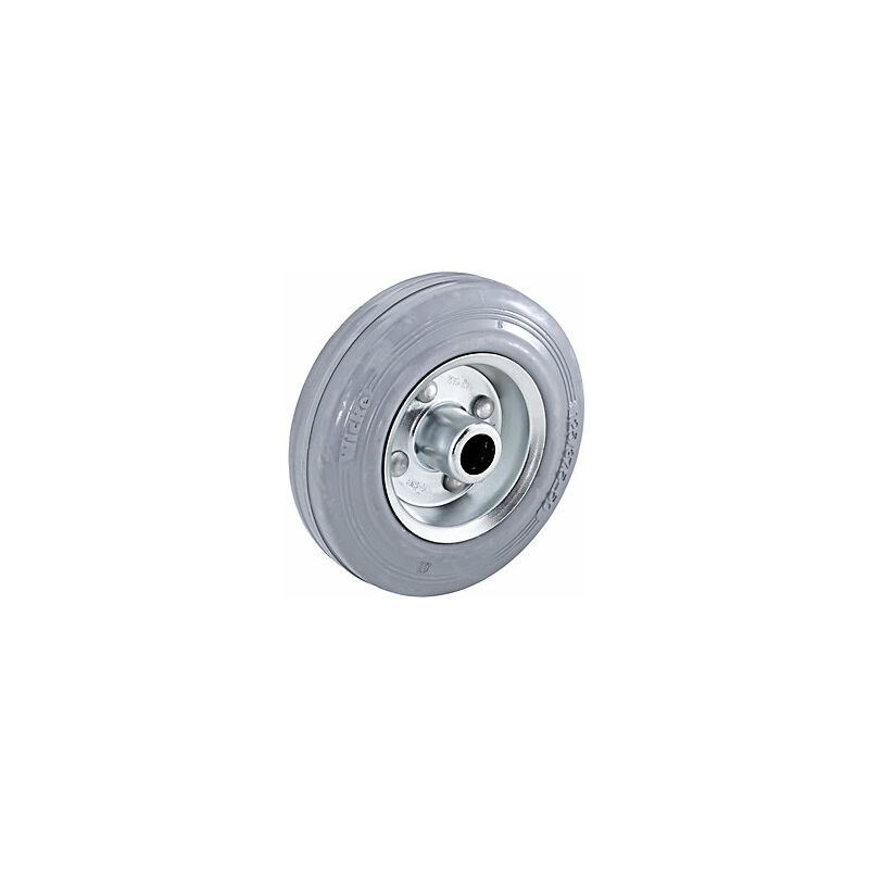 Ruota in gomma piena, a profilo liscio, su cerchione in lamiera d'acciaio, cuscinetti a rulli, Ø x larghezza ruota 125 x 38 mm. Fornitura = montato. Forma = ruota. Materiale ruote = gomma piena, con profilo liscio. Materiale cerchioni = lamiera d'acciaio, zincata. Diametro ruote = 125 mm. Portata a 4 km/h = 100 kg. Larghezza ruote = 38 mm. Cuscinetti ruota = cuscinetto a rulli. Resistenza alle temperature = da -5 °C fino a +60 °C. Lunghezza mozzo = 50 mm. Foro mozzo = 15 mm. Durezza Shore = 82 ±3 A. Tipo di prodotto = ruote. Su cerchione in lamiera d'acciaio. Non lasciano impronte nere da attrito. Elevata silenziosità su pavimenti duri. Durezza 82 ±3 Shore A. Resistenti a temperature da -5 °C a +60 °C.