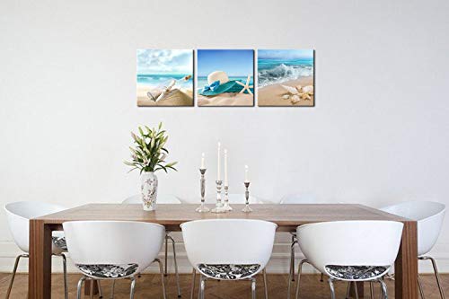 Set di 3 immagini ad alta definizione con stampa su tela, motivo marino, oceano, spiaggia, stile moderno, pronte da appendere per decorare le pareti di casa. Ogni pannello è dotato di un gancio nero già montato sul telaio in legno ed è pronto per essere appeso