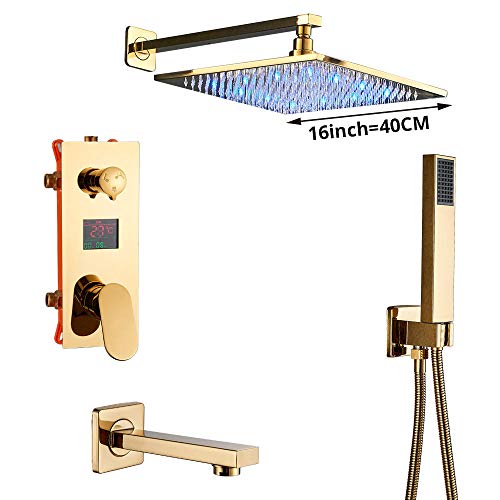 Wieoc Doccia digitale oro rubinetti set pioggia a led soffione doccia dorato 3-way digital temp display mixer tap vasca beccuccio doccia-Set da 16 pollici con doccia