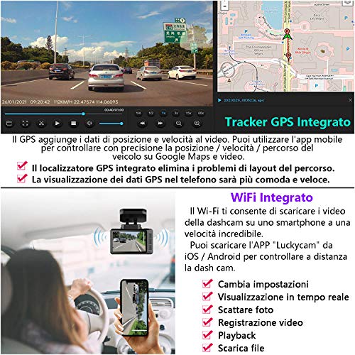 WiFi e GPS ▲ Scarica dal telefono l'APP "Luckycam" per modificare impostazioni, visualizzazione in tempo reale, riproduzione e il download dei file registrati. Questo rende più semplice che mai condivisione filmati dei tuoi viaggi su social media.▲ localizzatore GPS integrato elimina i problemi di layout del percorso. GPS aggiunge i dati di posizione e velocità al video. Puoi utilizzare l'APP per visualizzare con precisione posizione / velocità / percorso del veicolo. Più conveniente e veloce.