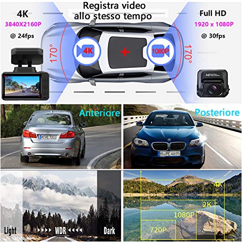 Dash Cam Anteriore e Posteriore ▲ Dash Cam con SONY IMX335 sensore, chip NT96675, apertura grande F1.6 e WDR. Doppia dash cam può registrare anteriore 4K UHD 3840 * 2160P e posteriore Full HD 1920 * 1080P Allo stesso tempo. Targhe, segnali stradali e paesaggi possono essere registrati chiaramente durante il giorno e la notte;