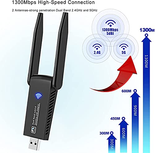 USB WiFi Dongle 1300Mbps,Adattatore WiFi USB 802.11 AC Dual Band 5GHz/2.4GHz veloce USB 3.0 alto guadagno 5dBi con doppia antenna adattatore di rete per PC Desktop Laptop Supporta Windows Mac e Linux