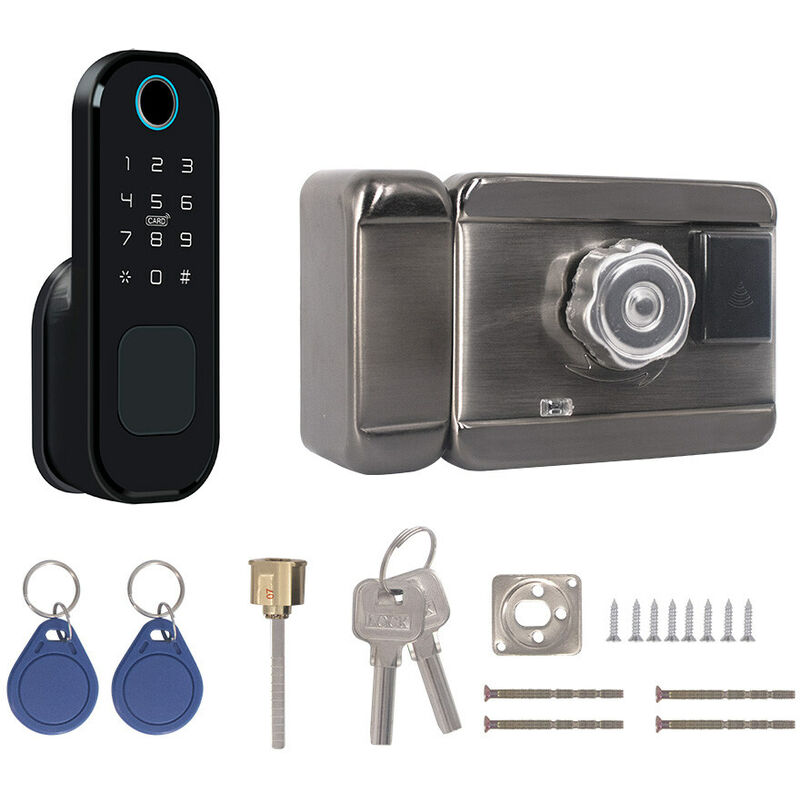 Cinque modi di sblocco, sblocco con impronta digitale, sblocco telefono, sblocco password, sblocco scheda magnetica, sblocco chiave, adatto per l'uso da parte di tutta la famiglia. Specifiche: Materiale: lega di zinco BT: sblocco tramite APP TT Lock Modalità di sblocco: app, impronta digitale, tessera, codice e chiavi Compatibile con Google Home, Amazon Alexa, Tuya Batteria: 4 * AA (non inclusa) Alimentatori di emergenza: Micro USB (non inclusa) Dimensioni dell'articolo: Blocco di scorta: 156 * 59 * 35 mm / 6,1 * 2,3 * 1,4 pollici All'interno del blocco: 133 * 100 * 22 mm / 5,2 * 3,9 * 0,9 pollici Peso dell'articolo: 1550 g / 3,4 libbre Dimensioni confezione: 250 * 190 * 80 mm / 9,8 * 7,5 * 3,1 pollici Peso della confezione: 1750 g / 3,9 libbre Lista di imballaggio: 1 * Pannello esterno 1 * Pannello interno 1 * Blocco 1 * Installa il pacchetto di accessori 1 * Chiave meccanica di grado C 1 * fibbia per porta 2 * carte I-C 1 * Specifiche 1 * Attestato di qualificazione