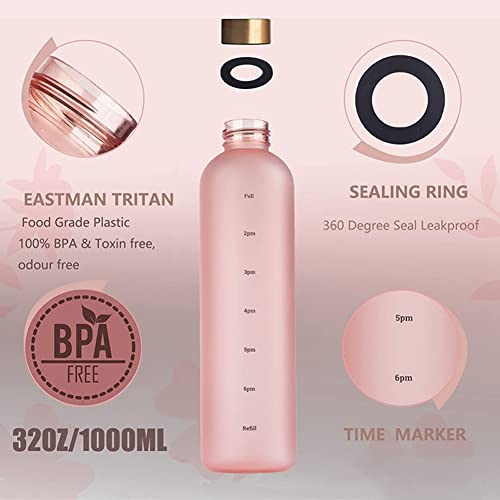 Wiianoxd Borraccia da 1 litro con indicatore del tempo, 32, motivante, riutilizzabile, fitness, sport, a prova di perdite, in plastica satinata, colore rosa