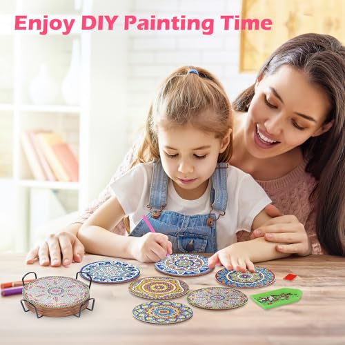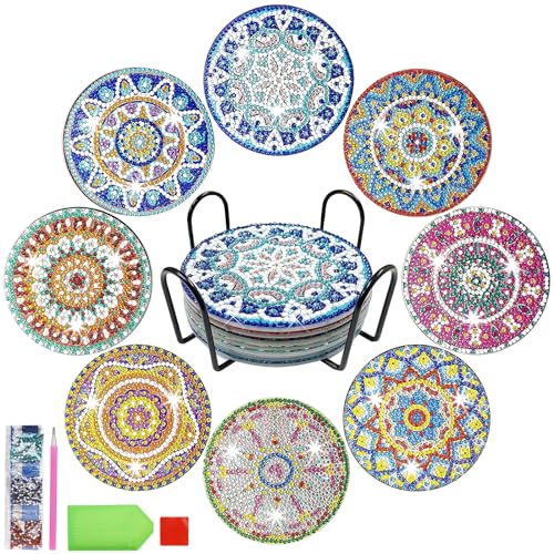 Wikay 8 Pezzi Sottobicchieri per bevande, Sottobicchiere con Pittura a Diamante, Sottobicchieri Diamantati con Supporto Kit, Sottobicchieri di Mandala fai da te, per Adulti Bambini Principianti