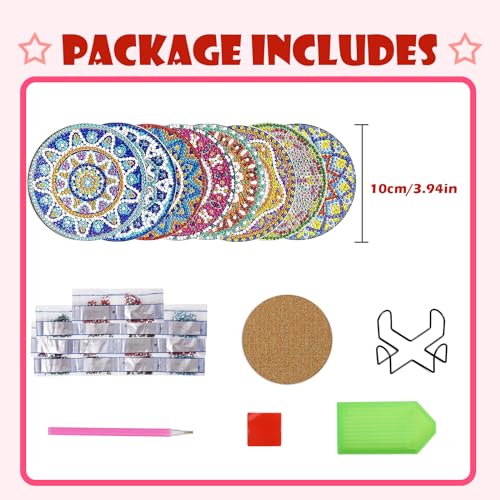 【La confezione include】Il set di sottobicchieri dipinti con diamanti include 8 pezzi di sottobicchieri dipinti con diamanti, 1 pezzo di supporto per sottobicchieri, 1 pezzo di penna per punti, 1 pezzo di vassoio per diamanti, 1 pezzo di adesivo per argilla e 14 confezioni di diamanti, ogni sottobicchiere ha un motivo mandala diverso.