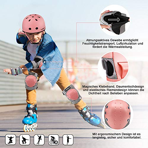 Wildya Casco da bicicletta per bambini, regolabile, per bambini/adolescenti/adulti, ginocchiere, protezione per le articolazioni, set per skateboard (rosa, L)