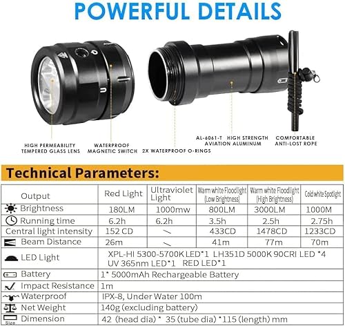 IPX8 100 m impermeabile subacquea】 Luce professionale per video fotografia, realizzata in lega di alluminio di alta qualità, durevole. Design di tenuta affidabile, regalo impermeabile o-ring. IPX8 e impermeabile fino a 100 metri sott'acqua. Assistente subacqueo affidabile!