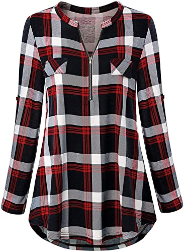 WILLIAMHUA Donna Tunica a griglia a Manica a 3/4 Camicia a Quadri Cerniera Scollo V Casuale Camicetta a Lunga Manica Blusa a Quadri Tops T-Shirt (L, Nero Rosso)