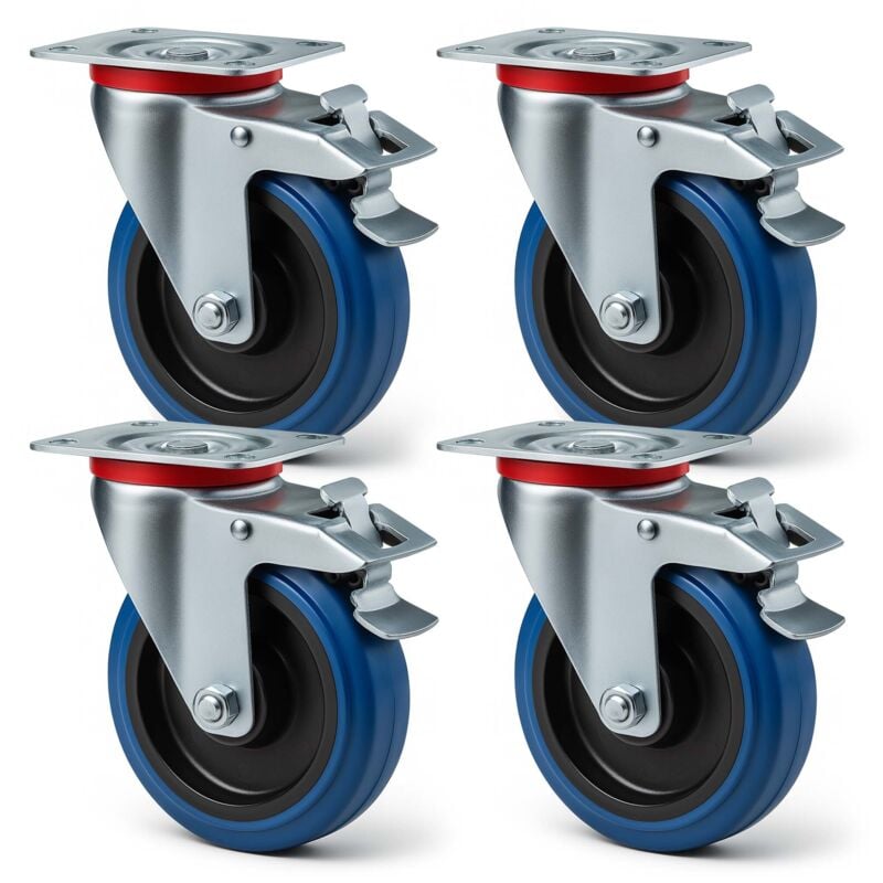 Quattro ruote piroettanti con 80 mm di diametro e piastra di montaggio da 105 x 80 mm Il corpo della ruota è in plastica, l'alloggiamento in lamiera di acciaio Il carico massimo è di 100 kg per ruota Ruote elastiche e scorrevoli per un elevato comfort di guida La ruota piroettante può essere completamente bloccata grazie al freno Con il set di quattro ruote piroettanti è possibile trasportare facilmente carichi pesanti. Le ruote possono essere montate sotto uno strumento da trasporto per spostare facilmente il carico da un luogo all'altro. Durante lo spostamento si mantiene il controllo della direzione di marcia e si può persino cambiare direzione con facilità. Le quattro rotelle piroettanti sono completamente bloccabili. Ciò significa che sono dotate di freni per garantire una tenuta sicura. Il carico massimo per ciascuna ruota è di 100 kg. Il corpo della ruota è in plastica, con cerchi elastici di colore blu. L'asse avvitato rende le ruote stabili. L'alloggiamento è realizzato in