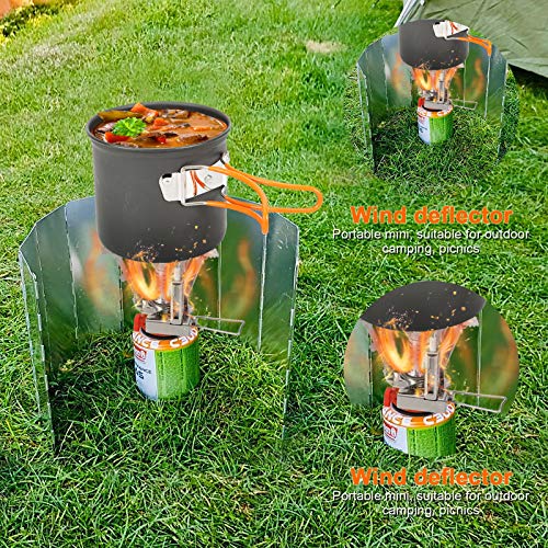 Contenuto della confezione: 10 pezzi kit di pentole da campeggio, 1 mini fornello + 2 pentole in alluminio + 2 cucchiai + 1 forchetta + 1 coperta per il fuoco + 1 borsa per il trasporto + 1 spugna per il lavaggio dei piatti + 1 piastra parabrezza.