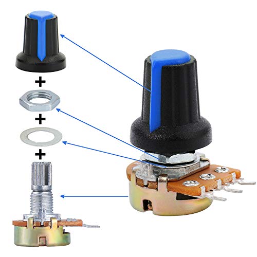 WiMas - Kit di 45 potenziometri per potenziometro lineare ad albero zigrinato, 9 valori, 3 potenziometro rotativo con manopole, dadi e rondella