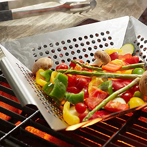 Win-Win Cestello per Barbecue in Acciaio Inox,Verdura Griglia per Cestello Barbecue, con Manico Curvo Vassoio per Grigliare Barbecue, con Fori di Sgocciolamento(Argento,24,5x24,5x4,2cm)